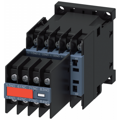 Вспомогательный контактор, 6НО+2НЗ, ном. питающее напряжение управления AC 220V 50Гц / 240V 60Гц, типоразмер S00, подключение кабелем с кольцевыми кабельными наконечниками, несъёмный модуль блок-контактов, для применений SUVA Auxiliary contactor SIRIUS 3RH2 for switching the control signals in the control circuit.