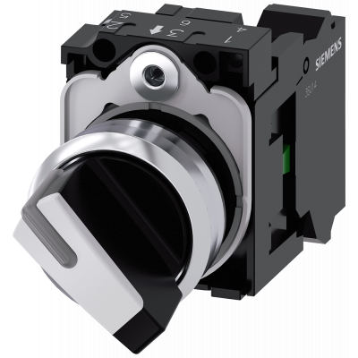 ПОВОРОТНЫЙ ПЕРЕКЛЮЧАТЕЛЬ С ВОЗМОЖНОСТЬЮ ПОДСВЕТКИ, 22MM, КРУГЛЫЙ, МЕТАЛЛИЧЕСКИЙ ГЛЯНЦЕВЫЙ, КОРОТКАЯ ЧЁРНАЯ РУКОЯТКА С БЕЛОЙ ВСТАВКОЙ, 2 КОММУТАЦИОННЫХ ПОЛОЖЕНИЯ O-I, С ФИКСАЦИЕЙ, УГОЛ ПЕРЕКЛЮЧЕНИЯ 90 ГРАД., 10:30Ч/13:30Ч, С ДЕРЖАТЕЛЕМ, 1NO, ПРУЖИННЫЕ КЛЕММЫ Selector switches SIRIUS ACT for switching and controlling electrical loads.